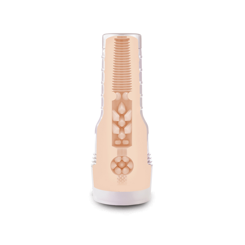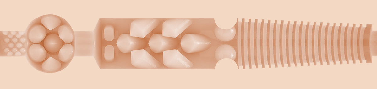 De Destroya-textuur is een wilde kracht die je volledig in beslag neemt. Bij je eerste stoot glijd je een strakke tunnel binnen met scherpe ribbels die je penis raken als een ontploffing van stimulatie. Dieper in de sleeve wisselen kegelvormige noppen en strakke kamers elkaar af, waardoor je een intense, bijna overweldigende sensatie ervaart die je steeds verder drijft naar een climax die je niet kunt ontwijken. Deze structuur bouwt een explosieve spanning op. Het is een textuur die je niet alleen fysiek uitdaagt, maar ook je zintuigen opschudt met een wilde, oncontroleerbare energie, alsof Stoya zelf je uitnodigt om je over te geven aan haar destructieve charme. De Destroya-textuur eindigt in een climax die voelt als een knallende finale – krachtig, onverwacht en onvergetelijk.